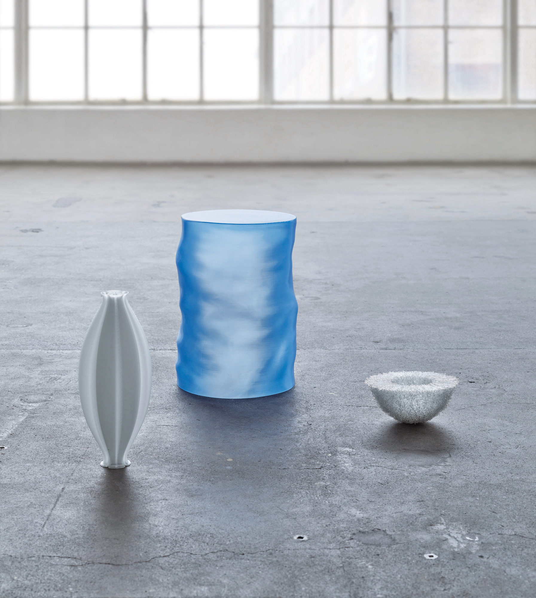 Copenhagen-based 3D printing studio 91-92 (ninetyoneninetytwo) presents a series of objects inspired by the fluid forms of sea creatures. Utilising only recycled PETG or PET material, these three organic forms – a vase, a bowl and a side table, create a series of intriguing and functional forms, whilst also allowing each piece to be produced without the need for support material – eliminating any material waste. The series forms part of an ongoing exploration into the role of 3D printing towards a more sustainable production model; local, utilising material waste and reducing energy consumption.