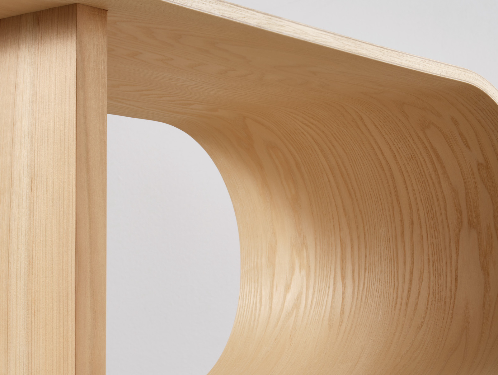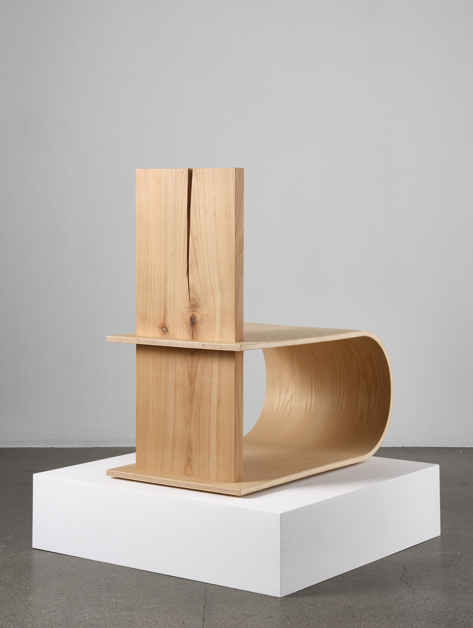 Bend to Caress Me was designed and constructed in order to bring to attention the disparities of raw, felled timber and the finished wood used within our furniture and homes. As part of a larger body of work titled Touch and Relate, this sculptural seating element combines two distinct functional components that invite the user to interact with the piece. While the veneered ash seating element is rounded and soft to touch, the Danish cherry wood back has all the marks of the tree in which it was cut from; the textural knot and long crack becoming the defining features of the piece. While Brandhøj utilises these natural markings to highlight the organic nature of timber, they are also used a reminder to the amount of beautiful wood that is not seen as suitable for industry. While the simplicity of the final form best represents the differences in the two wood products being displayed, it underlies the craftsmanship involved in combining raw and machined elements. The forms also bring into questions the balance between art and design, leaving the viewer to create their own line between functional sculpture and sculptural furnishing.