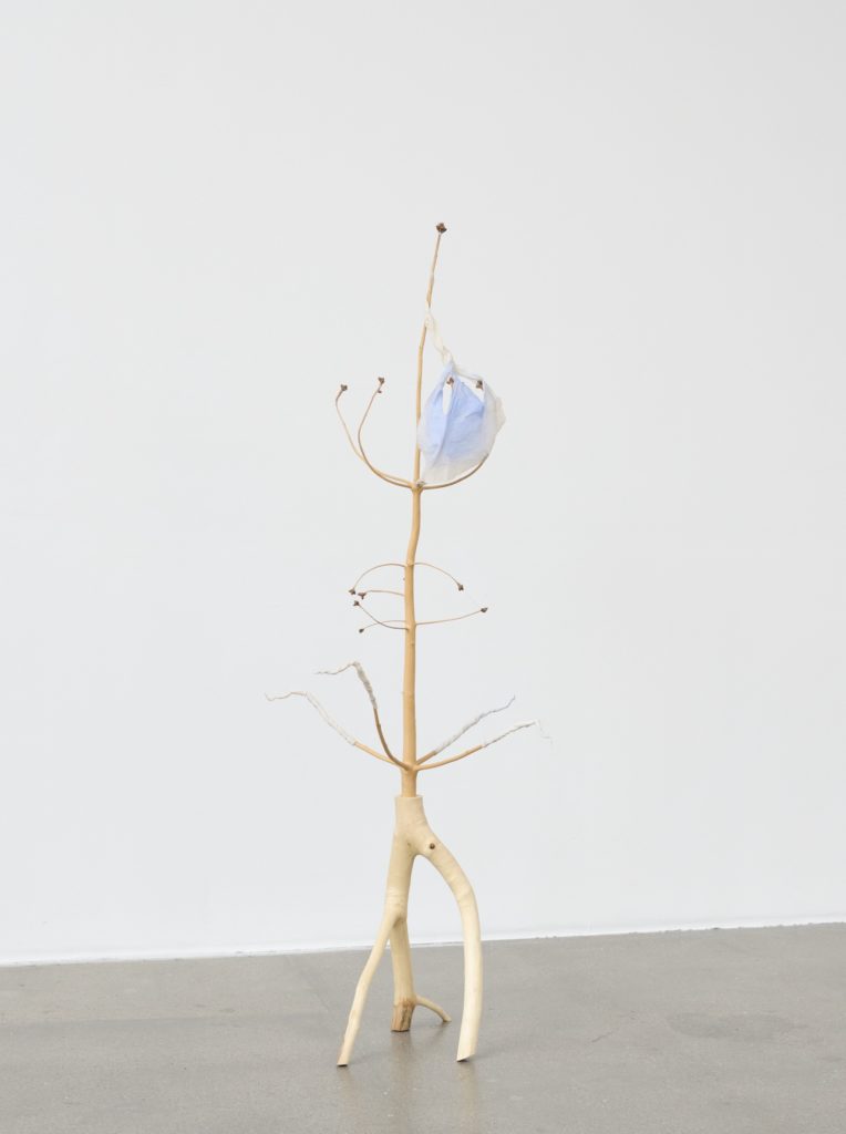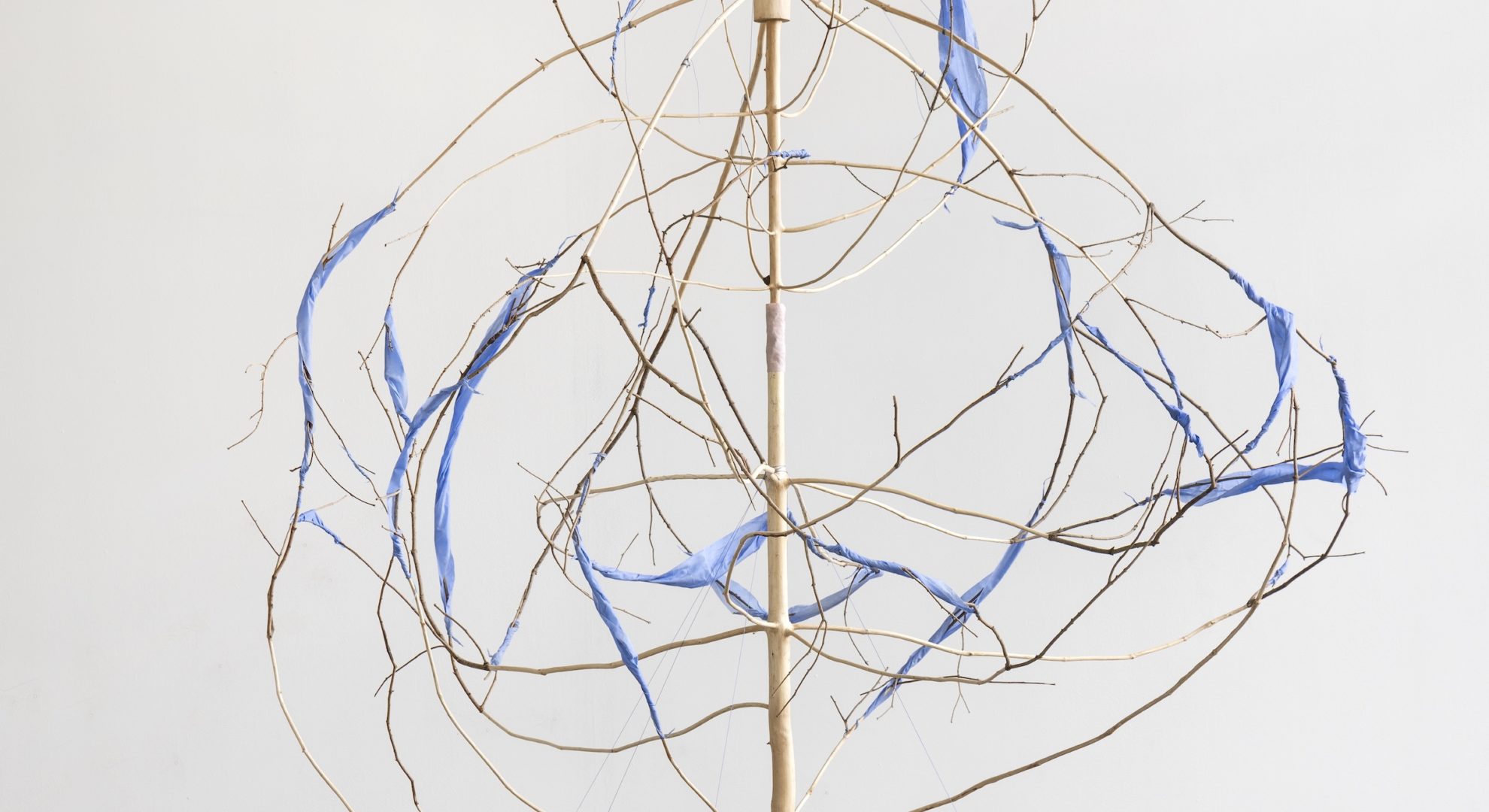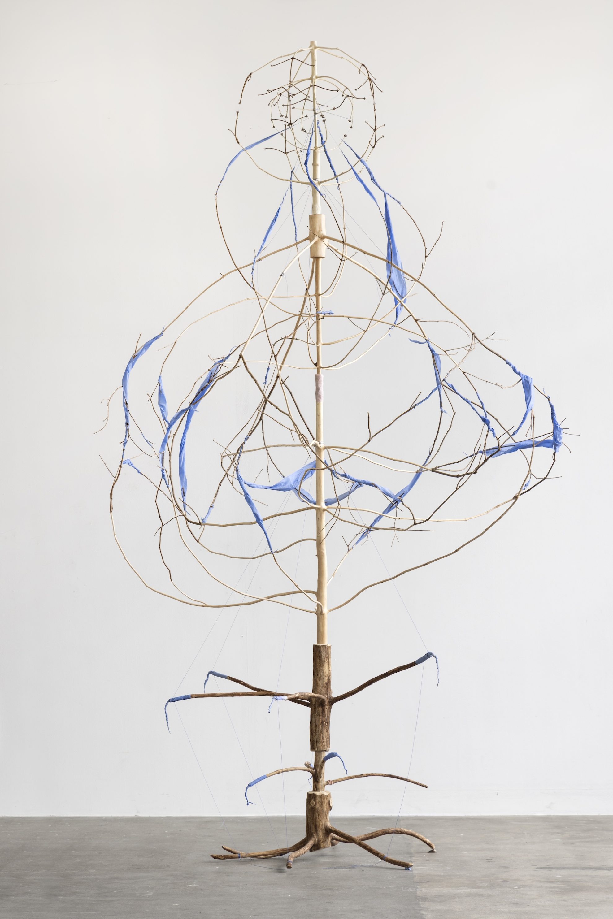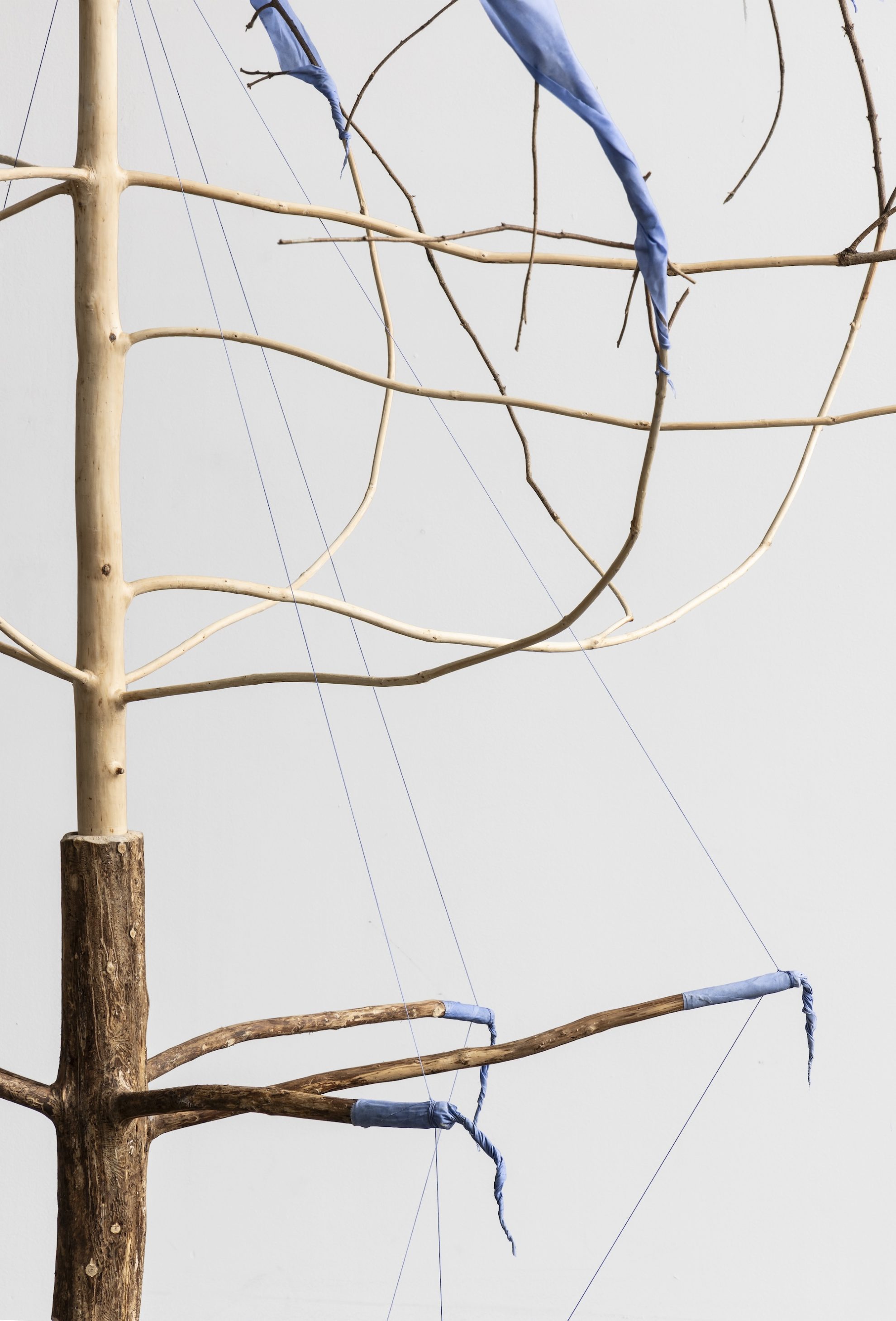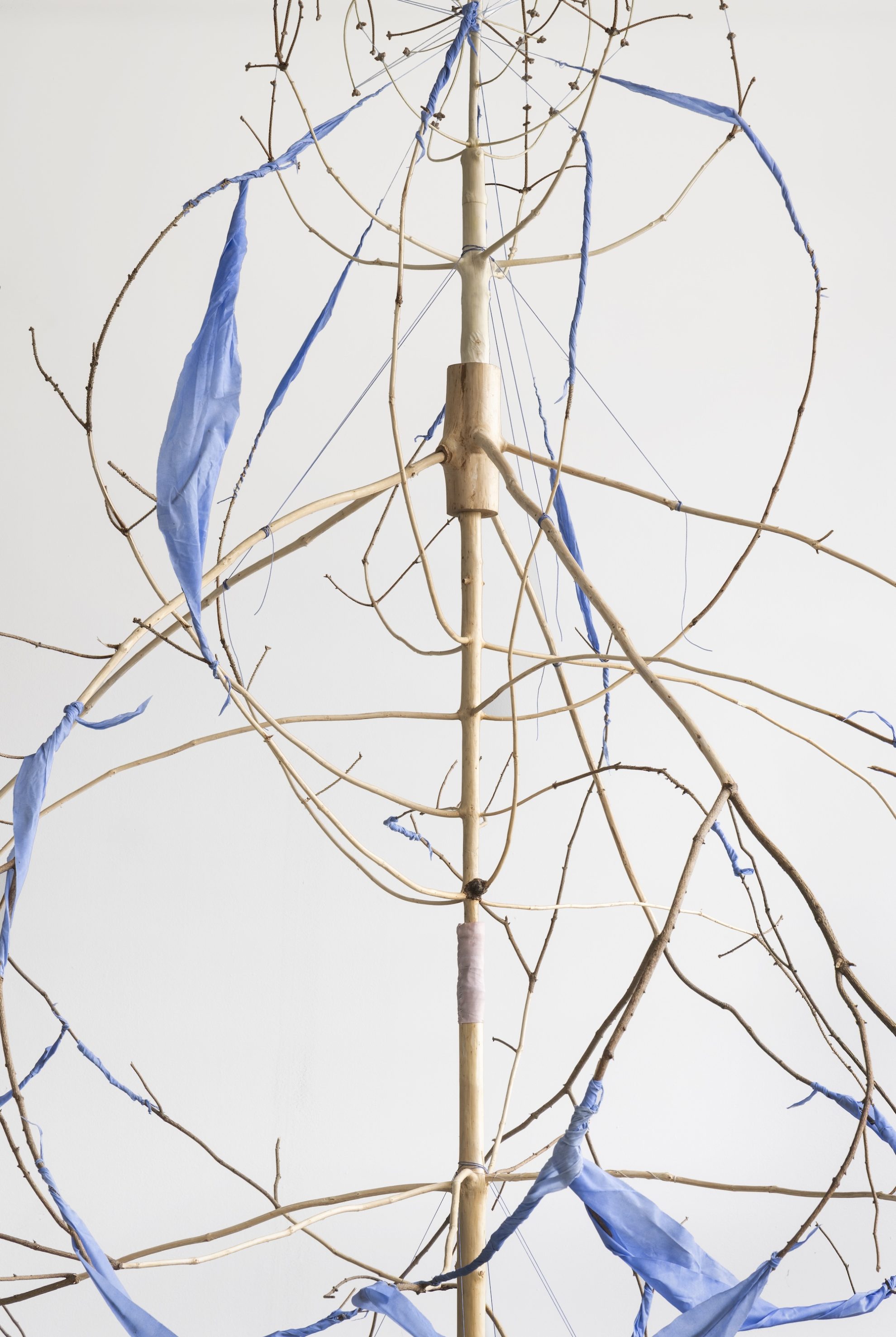 Forest Sphere and Little Blue were first exhibited as part of Bendixen & Baruël’s solo exhibition Wild Interiors at Officinet. Rather than a traditional exhibition, the duo approached the space as a laboratory of processes, exploring and questioning way in which humans can better understand and connect with nature through our spaces and structures. Within this setting, Forest Sphere was a central piece. Reaching over 3m in height, six sections of spruce tree trunks create a rhythmic, totemic structure with branches protruding at varying lengths and frequencies. The longer branching structures are connected by blue pigmented cotton that, when treated with bees wax, curl and stiffen much like the semi-clenched formations of leaf foliage. The connecting textile additions create a dynamic colour play with the raw branches while forming a circular spatial volume, architectural in appearance. Little Blue reacts to this larger subject through the combination of an up-turned ash branch at its base, and a slimmer spruce top interspersed with textile additions with touches of blue pigmentation. Together, the two works evoke memories of interactions with fallen trees and growing branches, whilst offering insights into the possibility of their expanded use as architectural components during a time of growing societal need to form deeper connections to our natural world.
