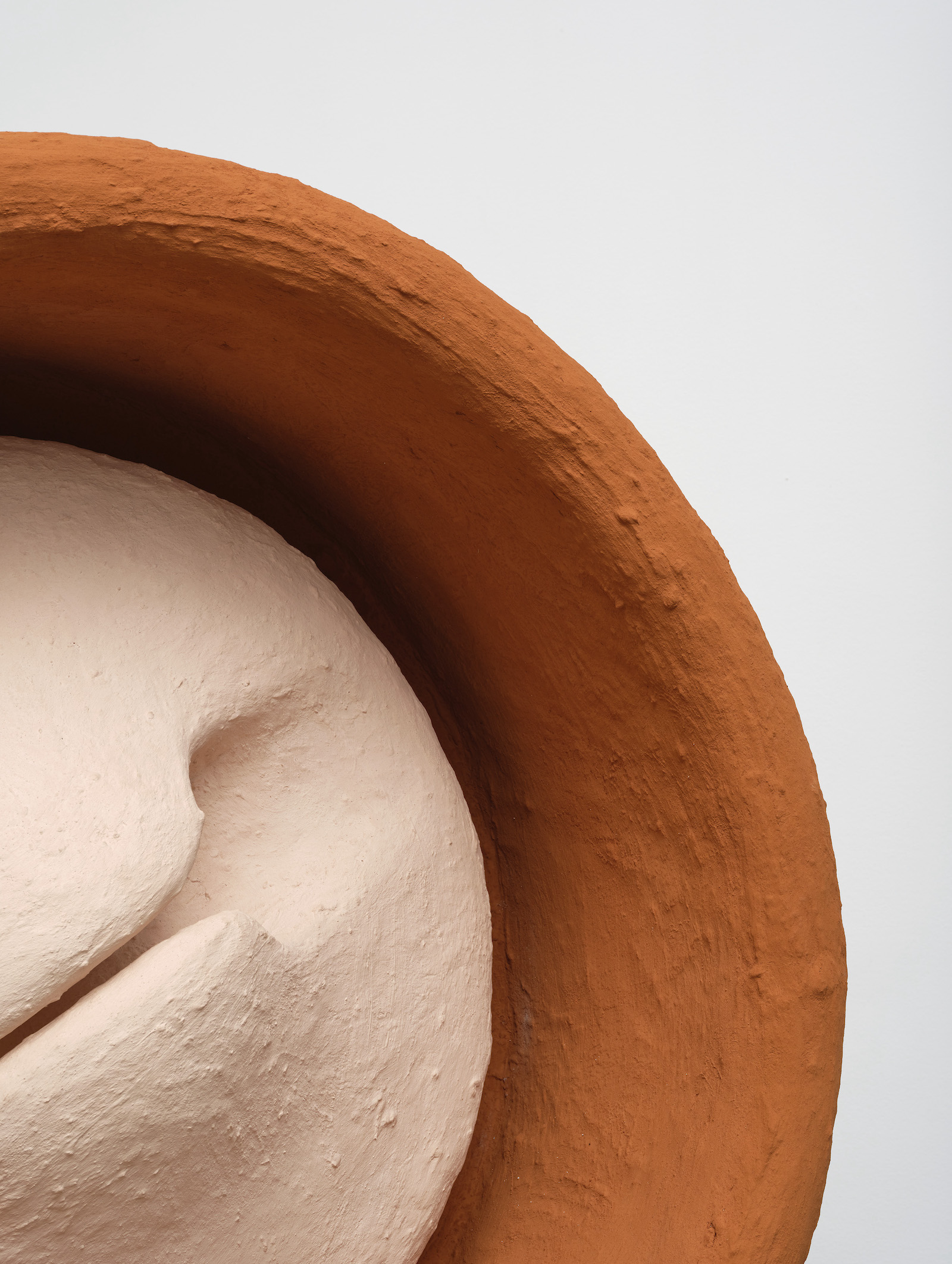 Poly Powder (Lip Tub) forms part of an ongoing study into the origins of colour within the sculptural work of Carl Emil Jacobsen. For the past seven to eight years he has embraced the context of his local surroundings within the east coast of the Danish mainland – sourcing local pigments from stones and locally produced bricks and building materials. Producing all of his work by hand within his studio, this commitment to locality forms the basis of a practice rooted within its context. While colour and texture are direct results of his detailed research into local materials, the forms he applies his materials to are born from intuition and the process of creation within the workshop – seeking out forms and shapes that promote an emotional connection with the audience. Poly Powder (Lip Tub) balances notions of expression with forms that highlight the unique tonal values of the pigments, and the texture of the applied material. A circular outer form encases the pink internal ‘lips’ – appearing to float, their puckered centre creates dimensionality that plays with light and shadow. Tipped on its side rather than laid flat, the orientation of the piece encourages interaction with the viewer, providing the ability to delve into each crack and crevice.