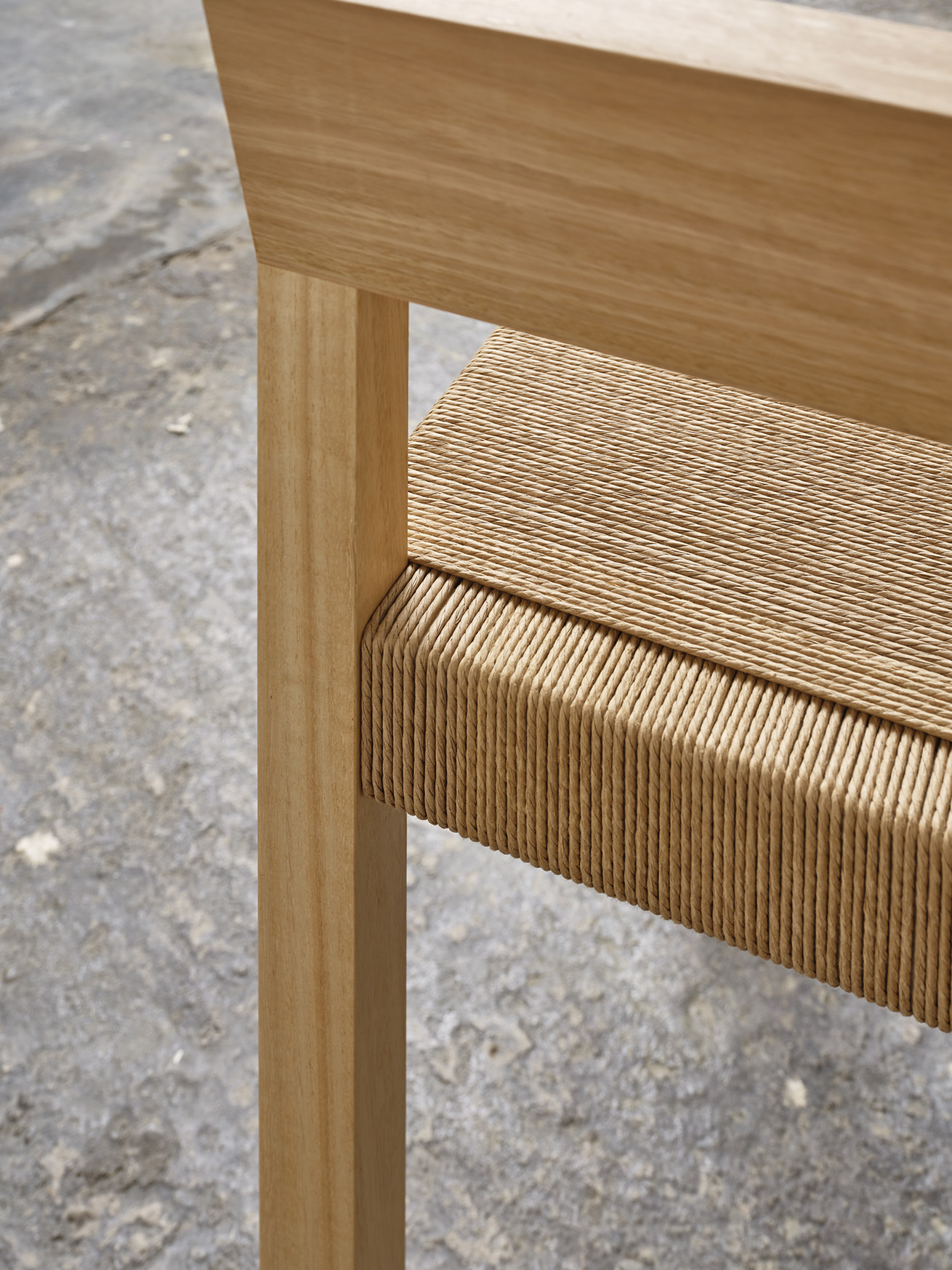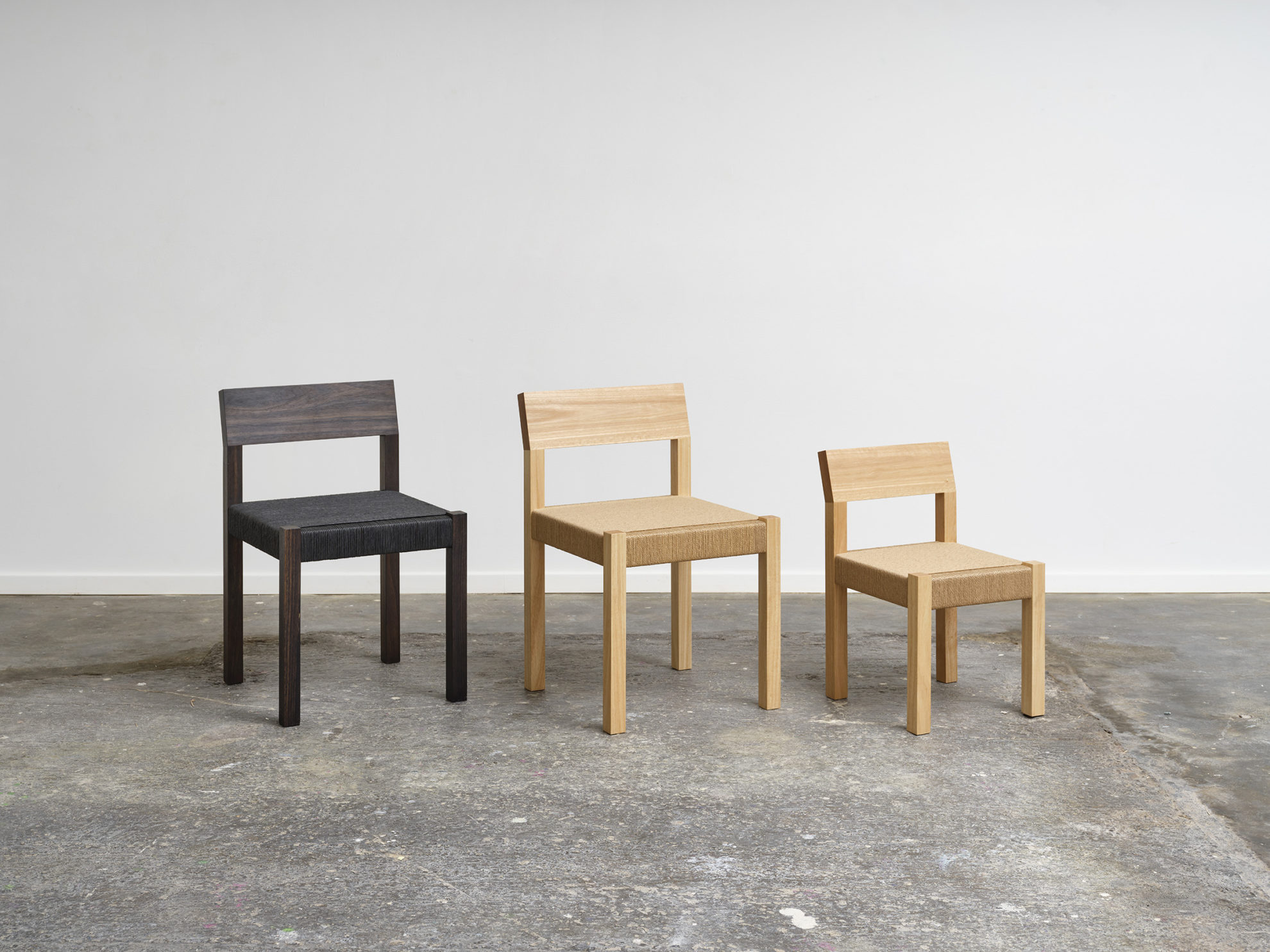 The 4 x 4 dining chair and 4 x 4 kids chair form part of a larger family of seating furniture designed around the same components, with each unit constructed from three sections of solid wood cut to length and joined using ovulated dowels. Maintaining the same sized components creates a shifting yet consistent design language as various functions change the proportions of the design – an elongated seating bench or a chunky kids chair for instance. The reason for the consistency within these components is due to Tjærby’s deeply considered use of material, with square and rectangular components maximising the yield of each felled tree. At the same time these simple components create an archetypal form that sits comfortably against one another, with combinations forming bench units or seating rows. The oversized frame of the 4 x 4 collection creates a strong and durable seating platform, allowing the seating base to change materials and techniques whilst maintaining strength, just as the frame can be finished in various wood species or alternatives such as extruded aluminium.