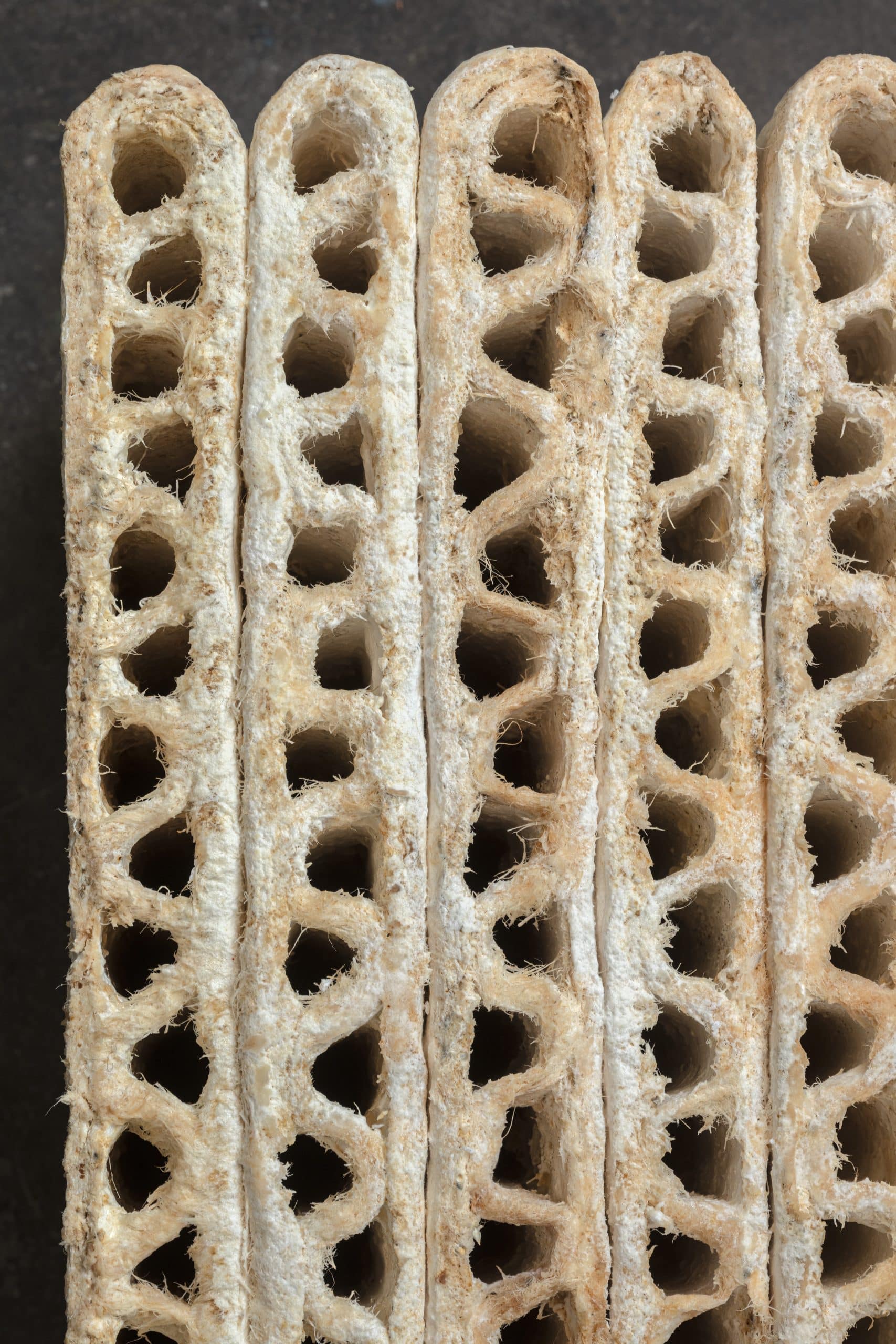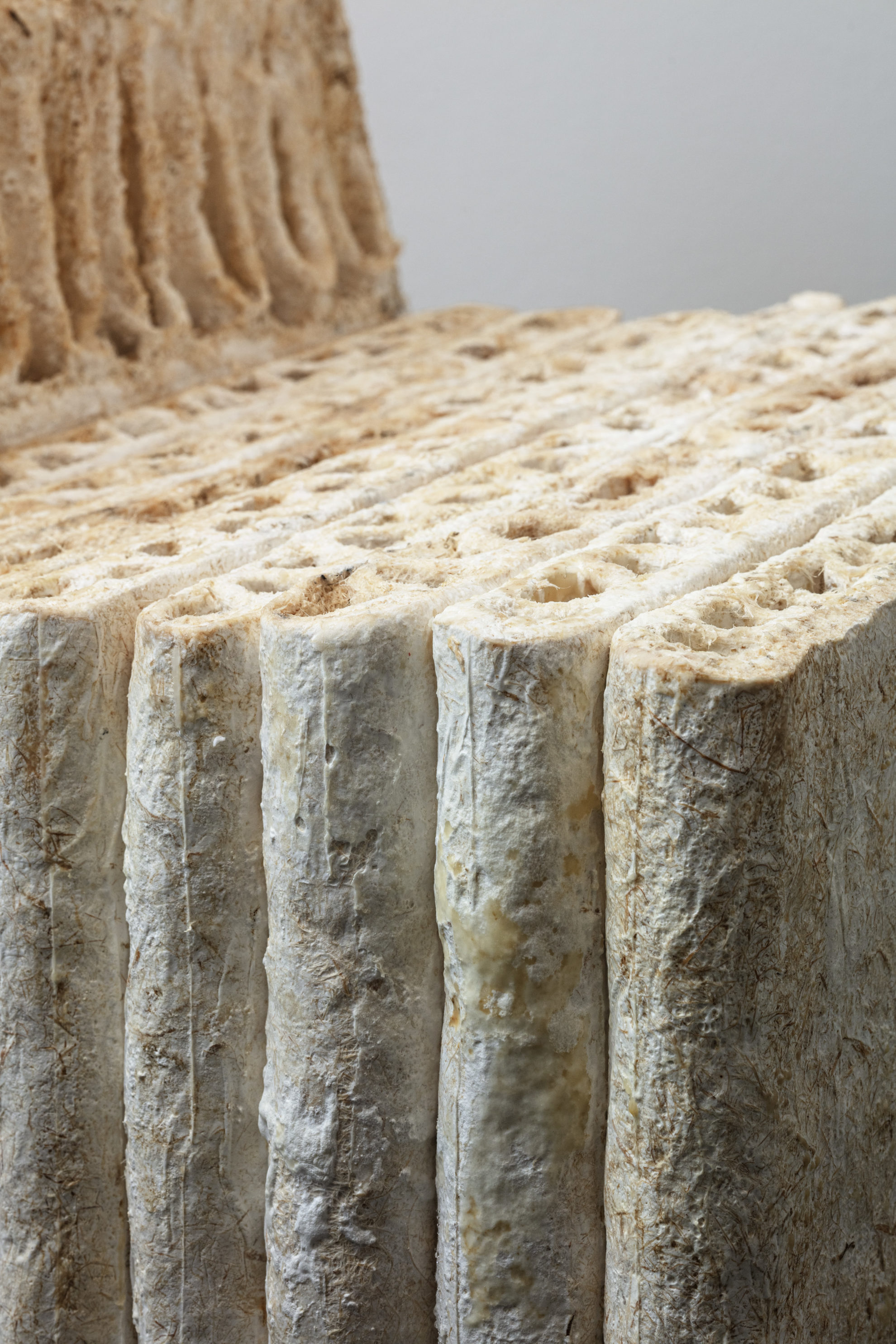 Jonas Edvard’s MYX Chair is made from mushroom mycelium (the root structure of mushrooms) and hemp fibres produced in a natural but controlled way. The rootlike structure of the mushroom is grown in between layers of hemp fibres, to create an organic composite that is both strong, lightweight and requires no additional energy during production. The mushroom feeds on the natural source of cellulose and the components of the fibres glues the structure of materials together, into a solid form – the MYX Chair. The construction of the chair is made from several layers of hemp fibre matts, moulded and folded in shape to create a laminated board with a corrugated structure, which is then grown into a solid shape to create a lightweight and strong chair. The production time is approximately three to six weeks and will last you for as long as nature intends.