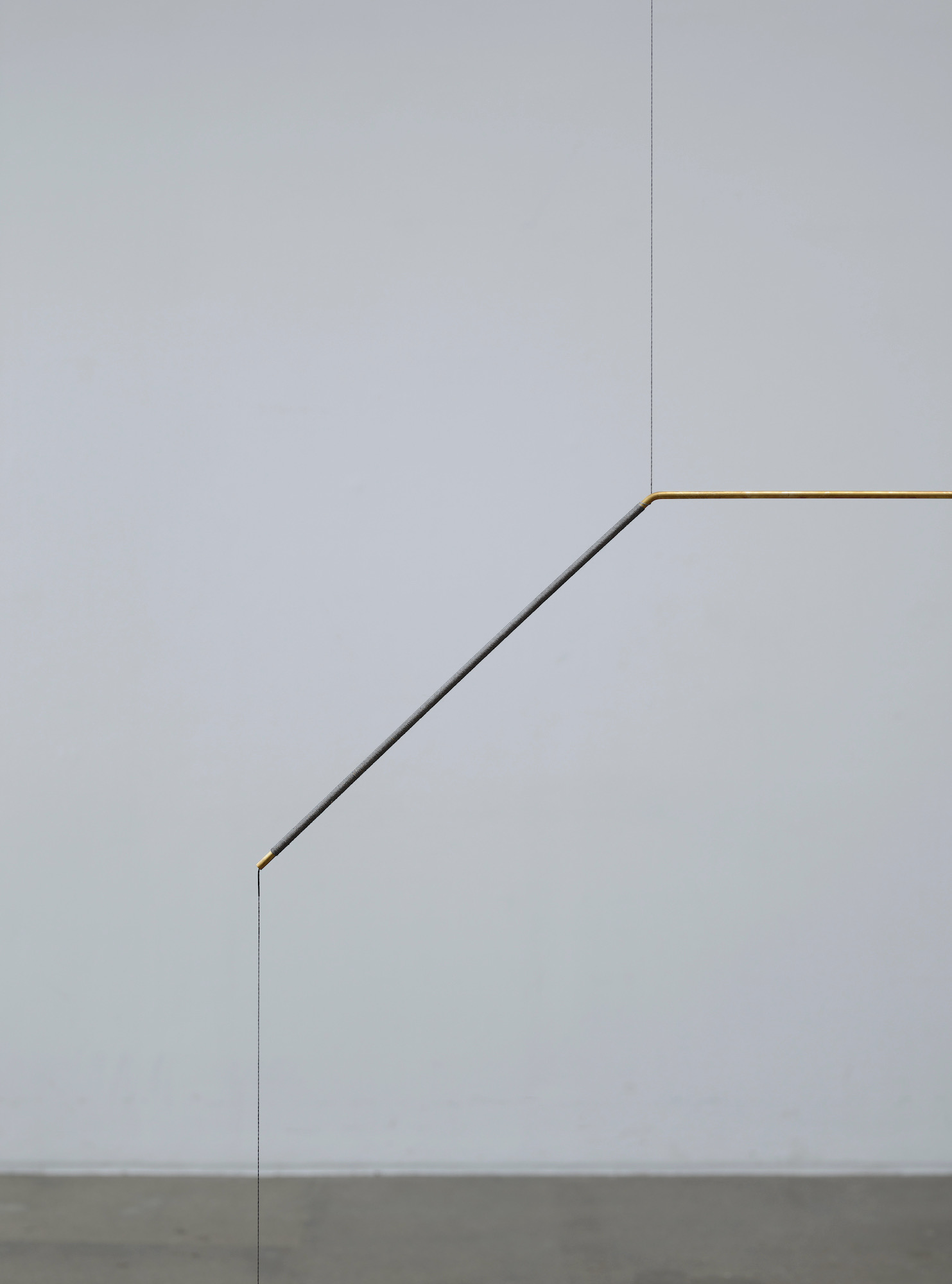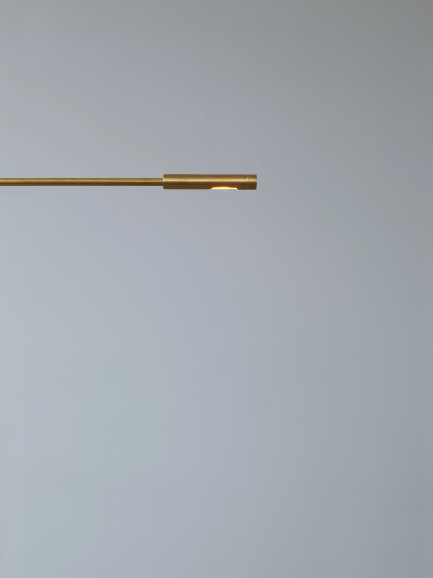 The composition of Suspense by Danish designer Kasper Kjeldgaard utilises a mix of positive and negative space to redefine the connection of objects to their spatial environment. Although a functional object in its essence, the piece utilises the space underneath its hanging structure as a poetic opportunity. Connecting an LED light source and a curved brass rod, Kjeldgaard has experimented with the application of the lamp’s functional cable as an opportunity to provide the composition’s sculptural framework. Weaving this stainless steel wire cable, Suspense eliminates the need for functional interference, instead transforming the electrical wire into an artistic centerpiece. The work operates both as an abstract sculptural work, and as a more classical piece of design with an architectural relevance to space and form.