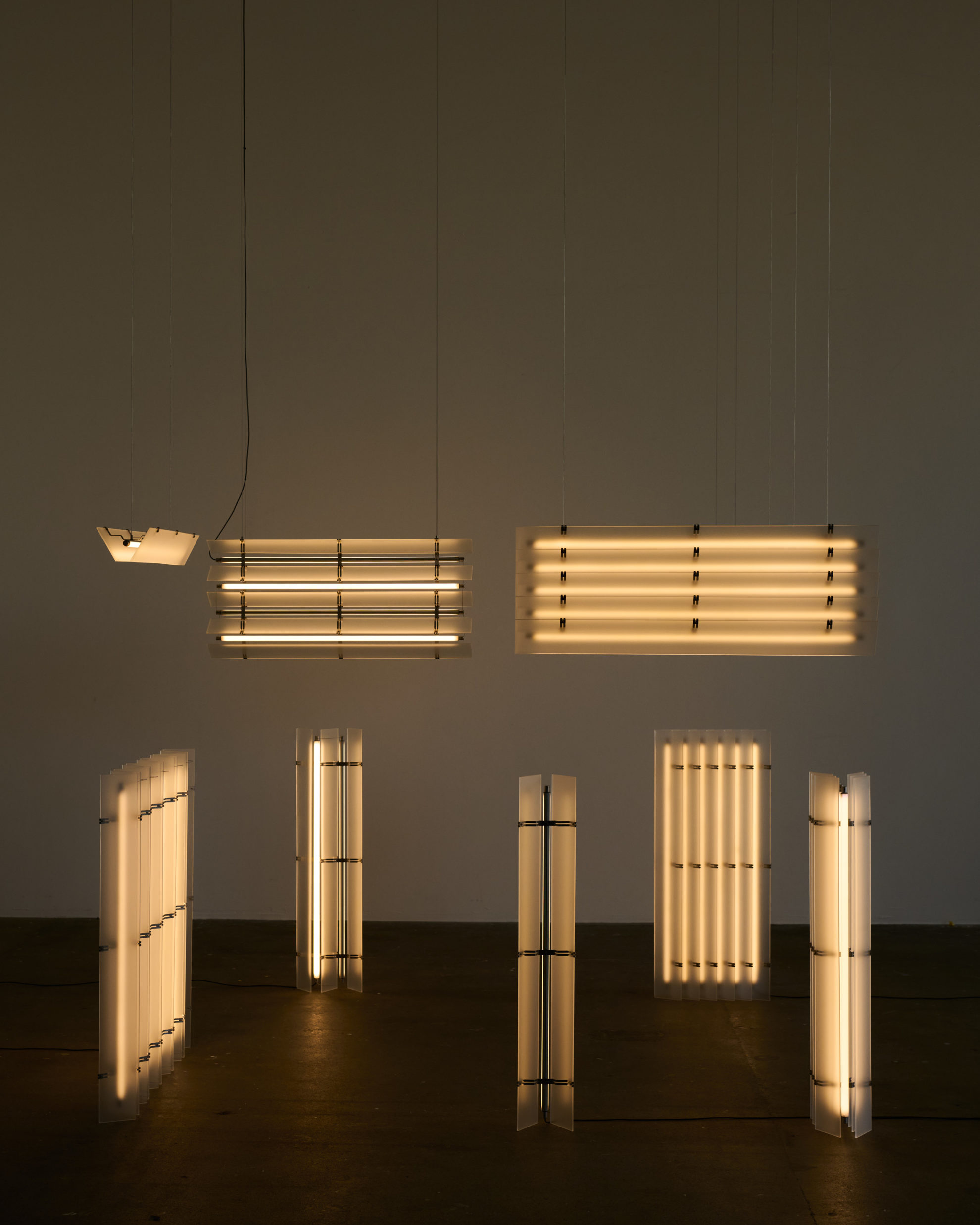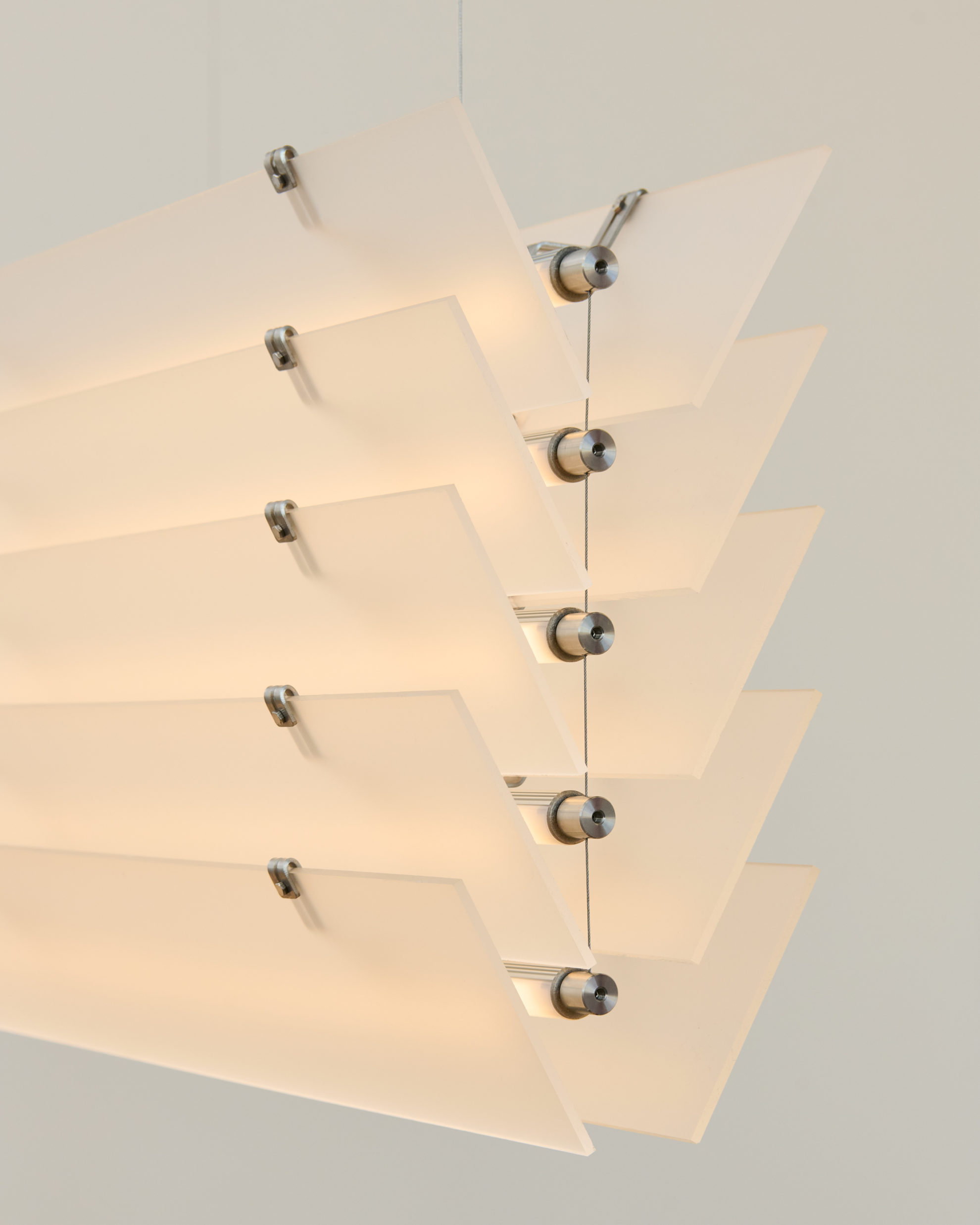 Rather than originating from a desire to create a lighting collection, Kasper Kyster began Strata by investigating modularity through two simple forms – a bracket and a plate. Quickly shifting his focus from furniture to lighting, the solid structural planes Kyster initially imagined have instead been replaced by diffused frosted acrylic that provide Strata its soft glow. With an aim to remove the complexities of modular lighting – both visually and technically, Strata instead focuses on simplicity in form, construction and installation. When presented as a floor standing lamp, the acrylic plates become a supportive component, with a single steel connection bracket having the ability to be flipped to allow modularity in both the X and Y-axis, as well as a hanging point when suspended. This simplicity and flexibility allows Strata to transform from tight configurations in smaller, homely settings; to large, space defining compositions of light within public environments. While currently presented as a lighting family, the building blocks of Strata allow Kyster to foresee various product families and environments through a system of design that continues the explorative and inquisitive way in which he approaches each body of work.