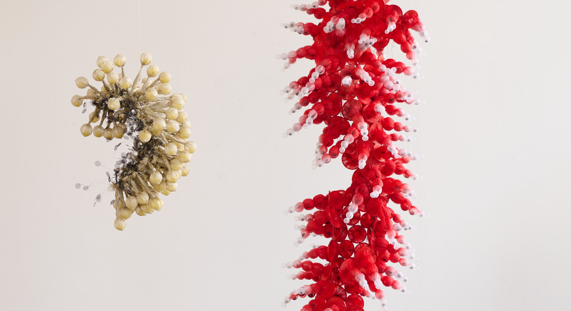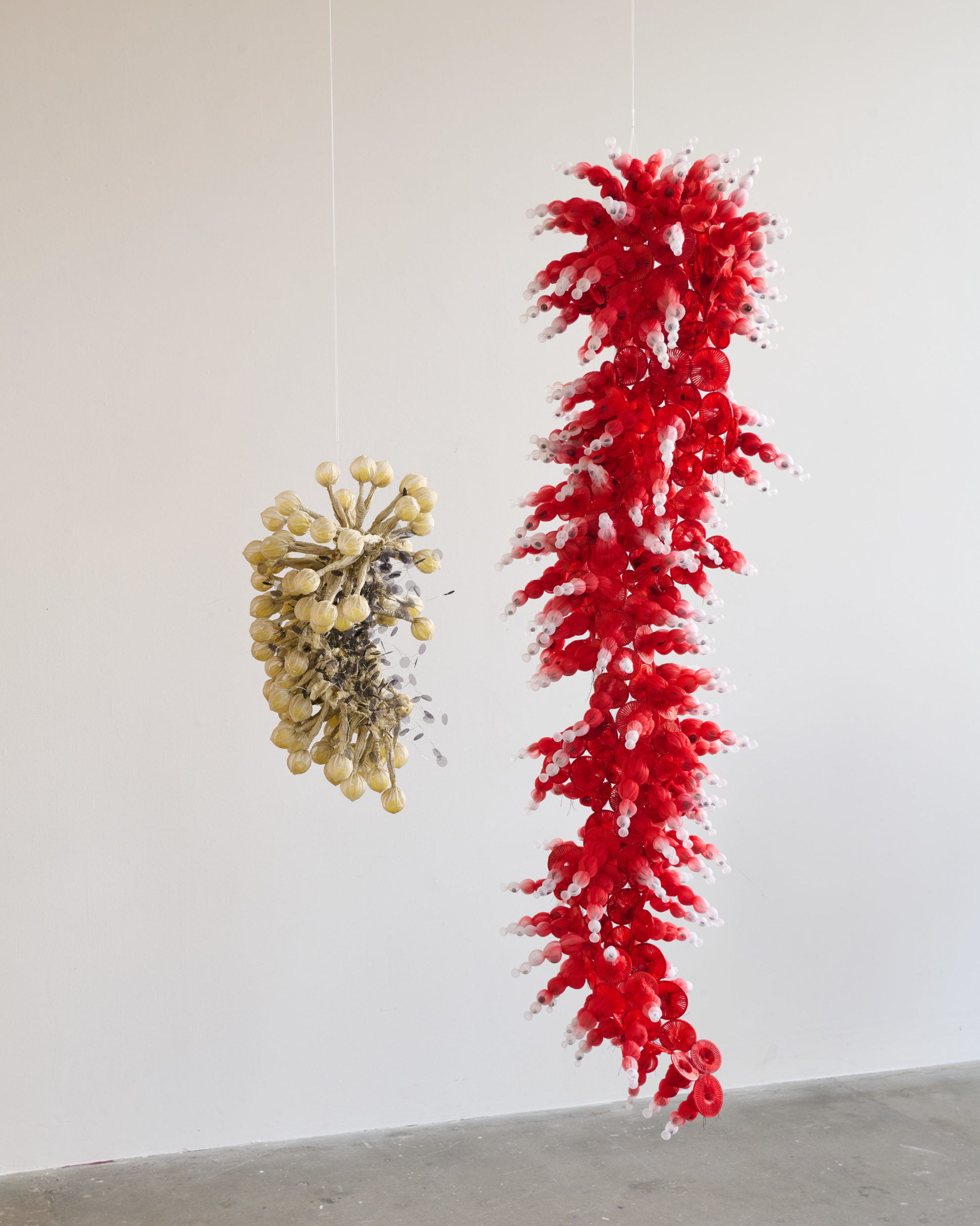 FIG 02 and FIG 03 by Lærke Lillelund explore concepts of system, scale and shape through suspended sculptural forms that combine a mixture of tradition and contemporary textile techniques and structural interventions. Both pieces are connected through their use of traditional Japanese shibori techniques that utilise heat-setting and fabric manipulation to create three-dimensional textile components. While FIG 02 is crafted from synthetic polyester organza that holds shape when heat-treated, FIG 03 is produced from silk – a natural material whose form fluctuates based on conditions and environments. Presented together, the two pieces express Lillelund’s ongoing explorations into textiles through a unique combination of intricate three-dimensionality and a mixture of digital printing and hand dyed fabrics.