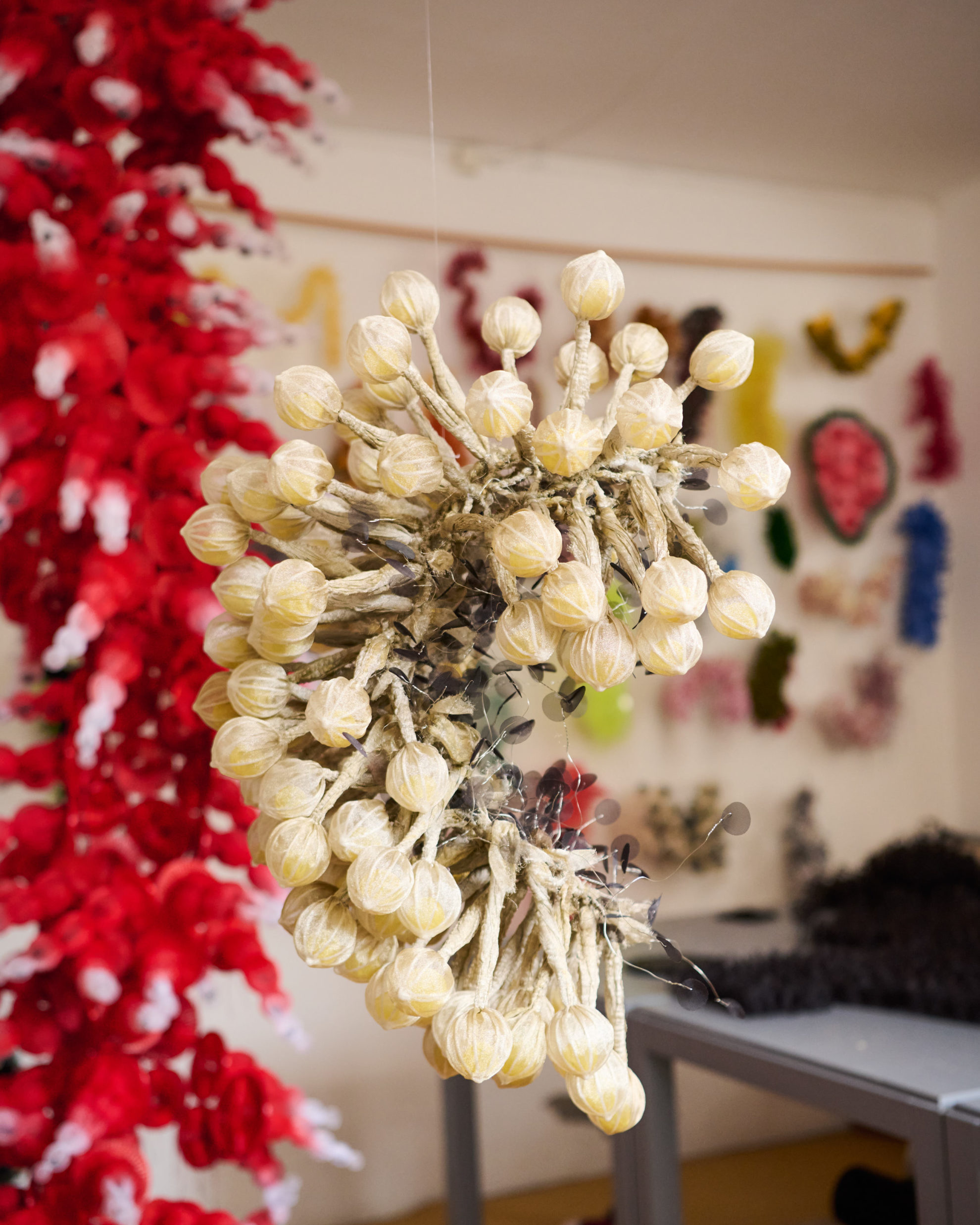 FIG 02 and FIG 03 continue from Lærke Lillelund’s ongoing body of work, Fiberium – a collection of physical experiments into materials and techniques that combine traditional textile crafts and digital processes. While these earlier studies remain small in nature, the modular way in which Lillelund explores systems has allowed her creations to grow; these latest pieces spanning from half a metre to over 2m in height. Assisted by a combination of steel wire and 3D printed structural and connecting components, the suspended forms provide the illusion of life and movement – their light weight allowing Lillelund to create voluminous forms through minimal structural interference. While the vibrant nature of FIG 02 has been created through a mixture of digital printing techniques on polyester organza fabric prior to heat-setting, the colours of FIG 03 are contextual to the appearance of the central metallic silk fabric – with Lillelund using highlights of digitally printed yellow polyester organza to contrast with the natural silk material. The two works mimic organic systems through their construction and configuration, while the soft nature of their textile forms invite the viewer into the welcoming world of Lærke Lillelund’s vibrant creations.