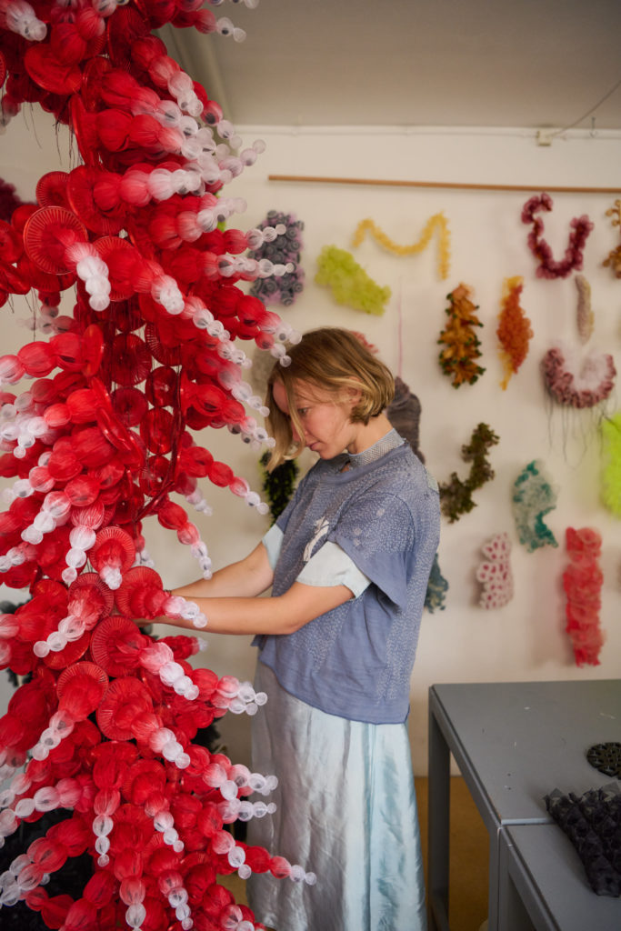 With a built up base of skill and knowledge from her work with set and costume design, objects for museums and backdrops for fashion shows, the personal explorations of Danish textile artist Lærke Lillelund present as a series of experiments into materials, treatments and systems. Inspired by traditional Japanese shibori techniques combined with heat-setting and manipulating fabric into 3-dimensional forms, her body of work builds on traditional crafts through the merging of digital and hand-printing on silk and polyester textiles. Working from her private studio in Islands Brygge and a larger shared work space in Copenhagen’s inner city, Lillelund utilises contemporary laser cutting and 3D printing techniques to bring a life-like three-dimensionality to her creations – their fluid and organic structures built on extensive research into how systems and modular components can be combined to create pulsating textile organisms that shrink and expand according to Lillelund’s wants and needs. She combines a depth in form with a colour palette that is both intuitive yet contextual to the inherent qualities of each textile, resulting in a body of work that is colourful and eclectic yet complementary and considered.