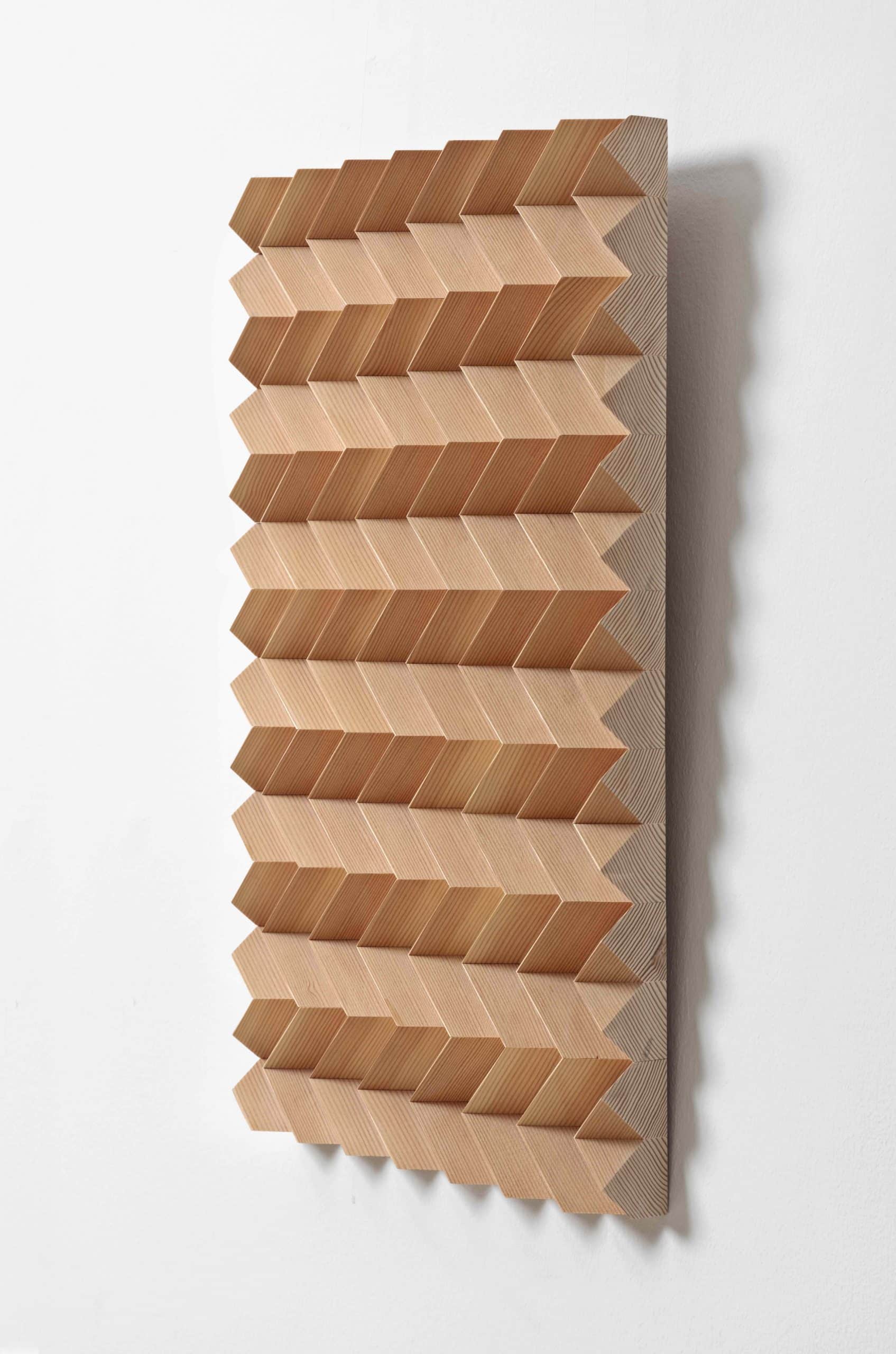 Origami Panel by Else-Rikke Bruun. Constructed from Oregon pine, the panel is a fusion of origami and wood produced with a table saw. Photo Credit: Dorte Krogh.