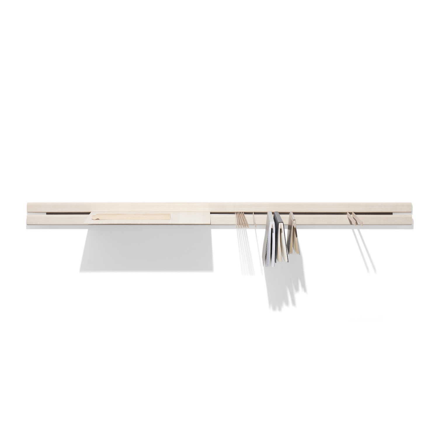 Poets Book Hanger by Jakob Jørgensen. Books hang from small, delicate bookmarks along a rail, produced for Mindcraft 12. Photo Credit: Jeppe Gudmundsen-Holmgreen.